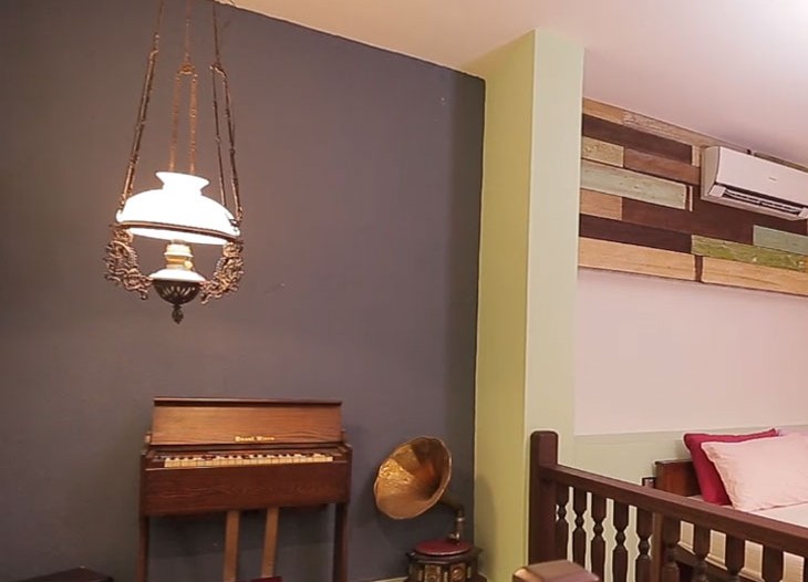 This duplex suite is tucked away at the south end of the building and ideal for those seeking solitary seclusion. This suite comprises of a bedroom on the top at the entrance to the suite, and a cosy den ideal for lounging and en-suite bathroom at the bottom, which are connected to the bedroom by a short flight of hard wood stairs. The bedroom and den have full-length timbre louvered windows that look out into the second air well, and are both air-conditioned. The bedroom is furnished with a mid-century style queen-sized teak bed and a wardrobe and cabinets for your personal items.